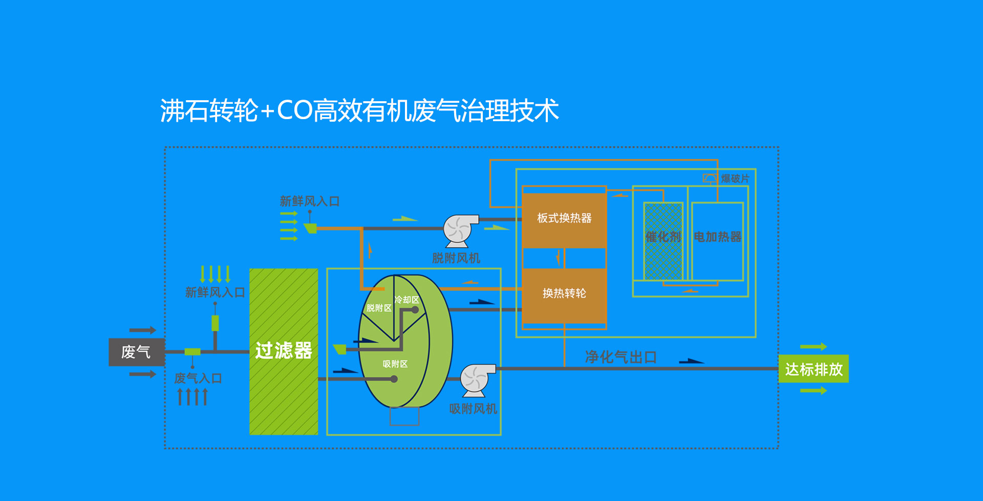 大風量、低濃度的有機廢氣的高效治理技術,適用于間歇式運行,降低設備投資及運維能耗。